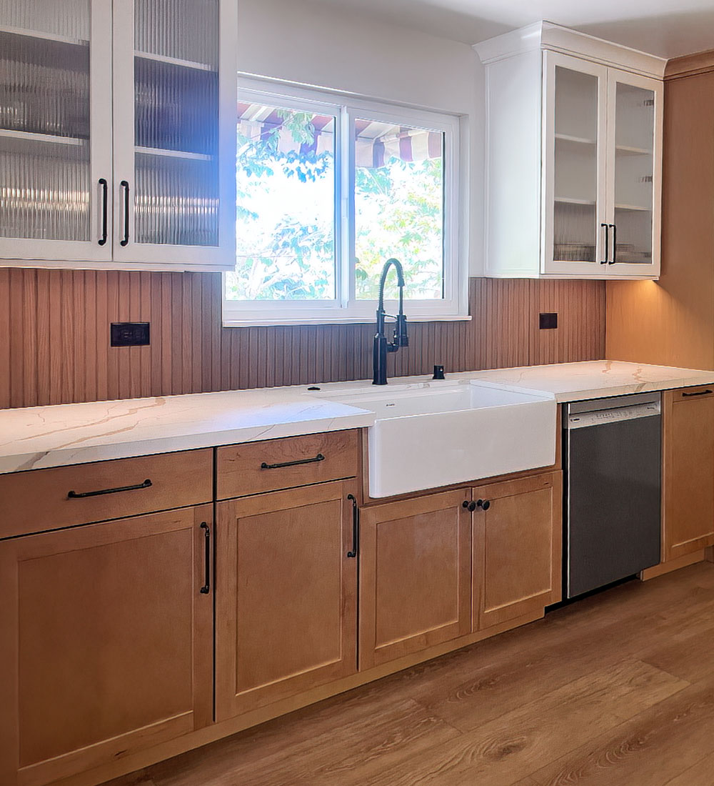 Natural wood cabinetry meets crisp white uppers and quartz countertops, while fluted glass doors bring lightness to the heavier materials. Matte black fixtures, a farmhouse sink, and vertical wood-look porcelain tile add texture and subtle character, with the overall composition keeping the space clean, functional, and welcoming.